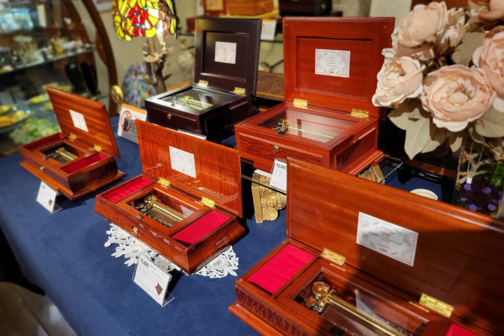 7月10日(木)より、山梨県の「河口湖音楽と森の美術館」のミュージアムショップ1階高級オルゴール売り場にて、弊社のオルゴールブランド「ハートフィールドオルゴール」の展示販売をおこなっています。