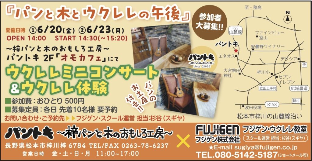 ウクレレミニコンサート&ウクレレ体験のお知らせ 2025年6月9日 最終更新日時 : 2025年6月11日 STAFFパンと木とウクレレの午後開催日時:①6/20(金) ②6/23(月) OPEN 14:00 START 14:30会場:~梓パンと木のおもしろ工房~ パントキ 2F「オモカフェ」にて参加費:おひとり500円募集定員:各日 先着 10名様 ※要予約お問い合わせ・ご予約先:フジゲン・スクール運営 担当:杉谷(スギヤ)※お申し込みはこちらのフォームからでも可能です。※お問い合わせはこちらのフォームからでも可能です。パントキさんのご案内関連