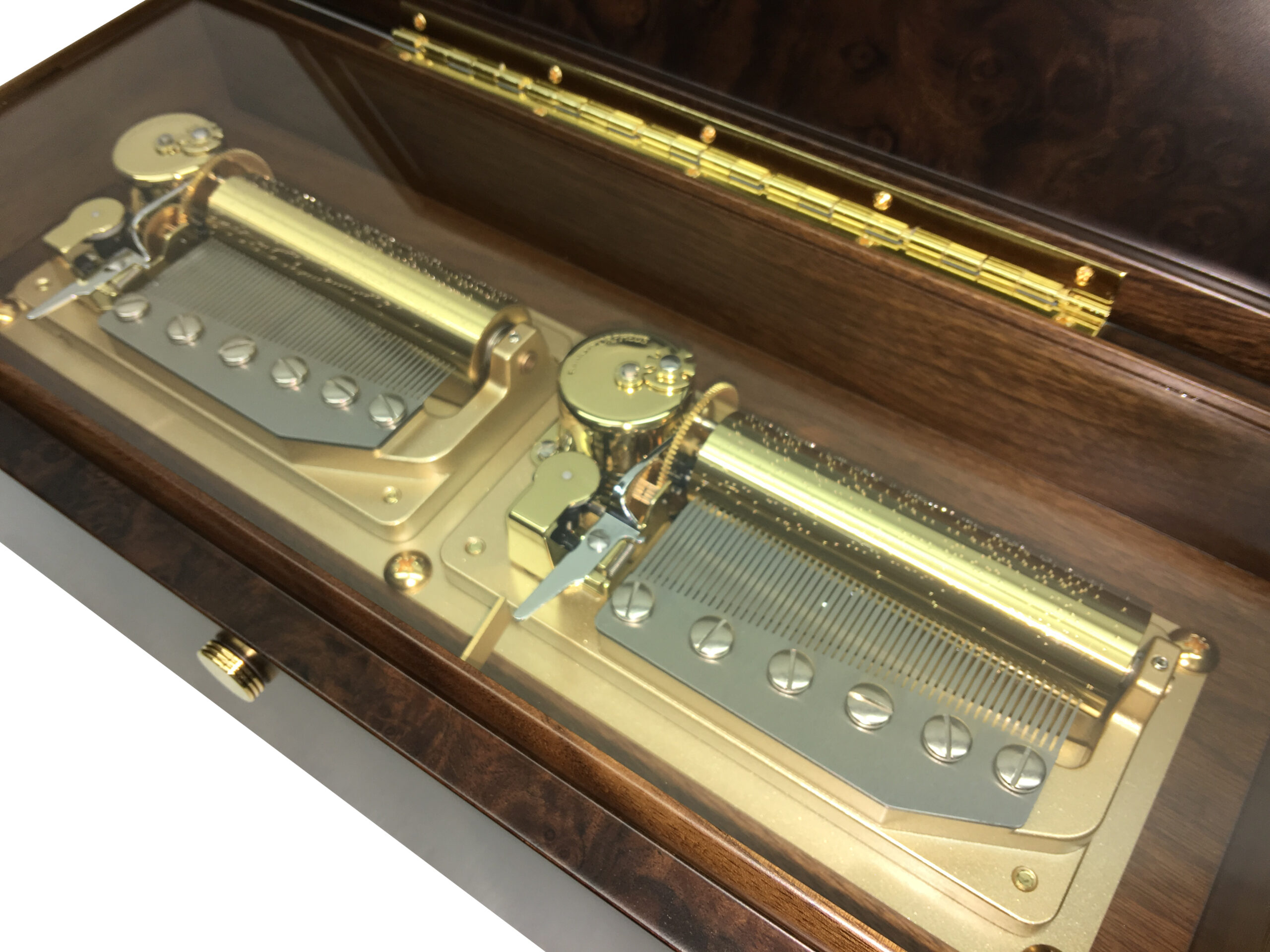 • 一つの動力(ゼンマイ)で2つの50弁オルゴールシリンダーを同時に動かします。